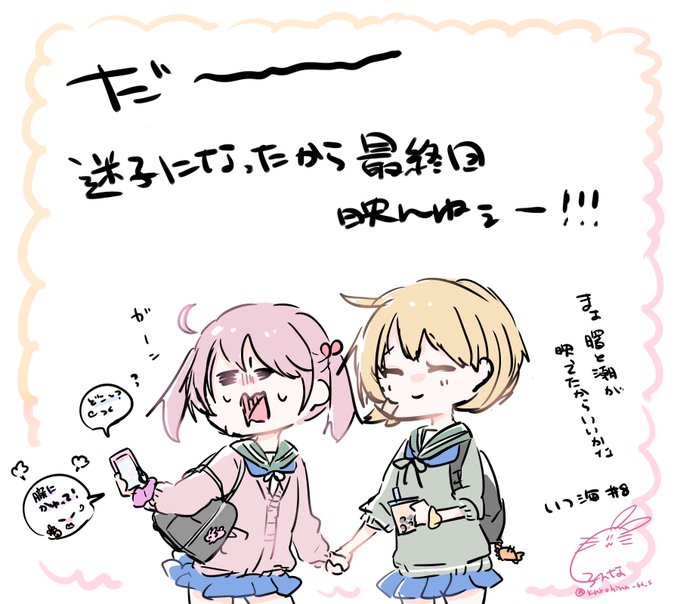 「なんなら放送前から感じてはいたけどこの場違いテンションのまま潮と曙を応援していいアニメではないかもしれない」 といつ海を観ながら思う漣と朧描きました…… みんな、生きて。