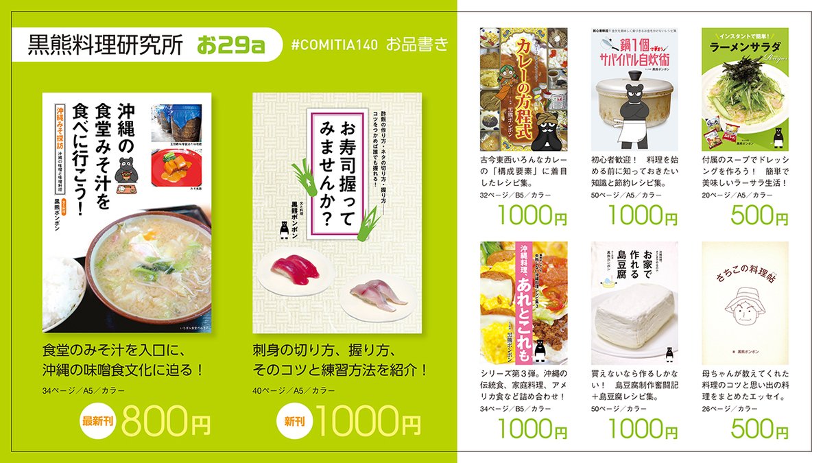 #COMITIA140 スペースいただけました! 5/5(木)東3「お29a」です! 一番新しいのは「沖縄みそ汁&味噌料理」の本。そのほか「お家で握り寿司」、「沖縄島豆腐」、「自炊ことはじめ」などなど、作って美味しい・読んで楽しいレシピ本を揃えてお待ちしております! どそよろー!