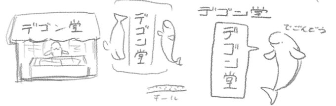 なかなかイラストが完成しないので、落書きを投稿。 スナメリちゃんのお店、デゴン堂🐬