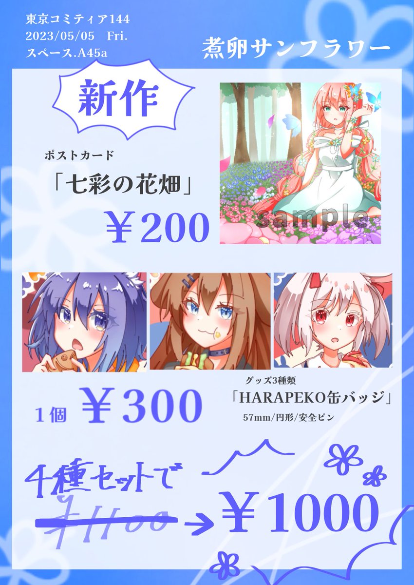 #コミティア144 5/5 #COMITIA144 のお品書き完成しました!! 前回の反省を踏まえ、ここ旅などの値段を一部変更しました(;´Д`) その代わり、手に取って頂きやすい様に工夫も沢山しました!(´˘`*) サークル名:煮卵サンフラワー スペース:A45a よろしくお願いいたします!!(*´︶`*)