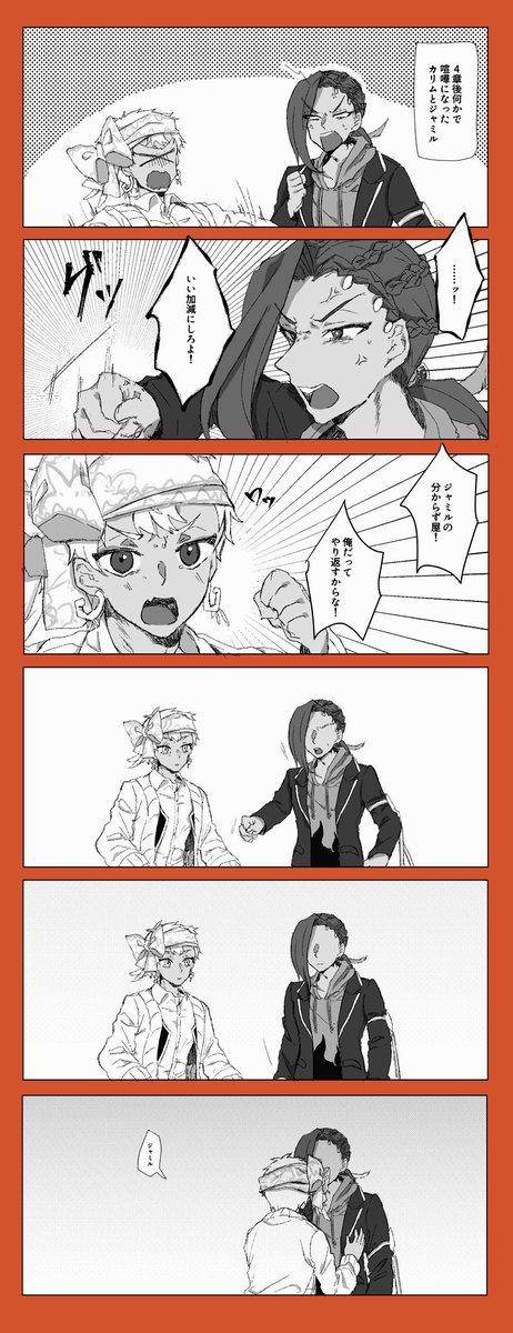 「ずっとお前はそういうやつだったよ」 ☆4章後スカラビア 喧嘩して脅し半分本気半分で手をあげようとしたら、カリムくんにとっては元から「そういう友達」だったから驚きも怯えもしないことを知ってしまったジャミルくんの話 #twstファンアート #ツイステファンアート