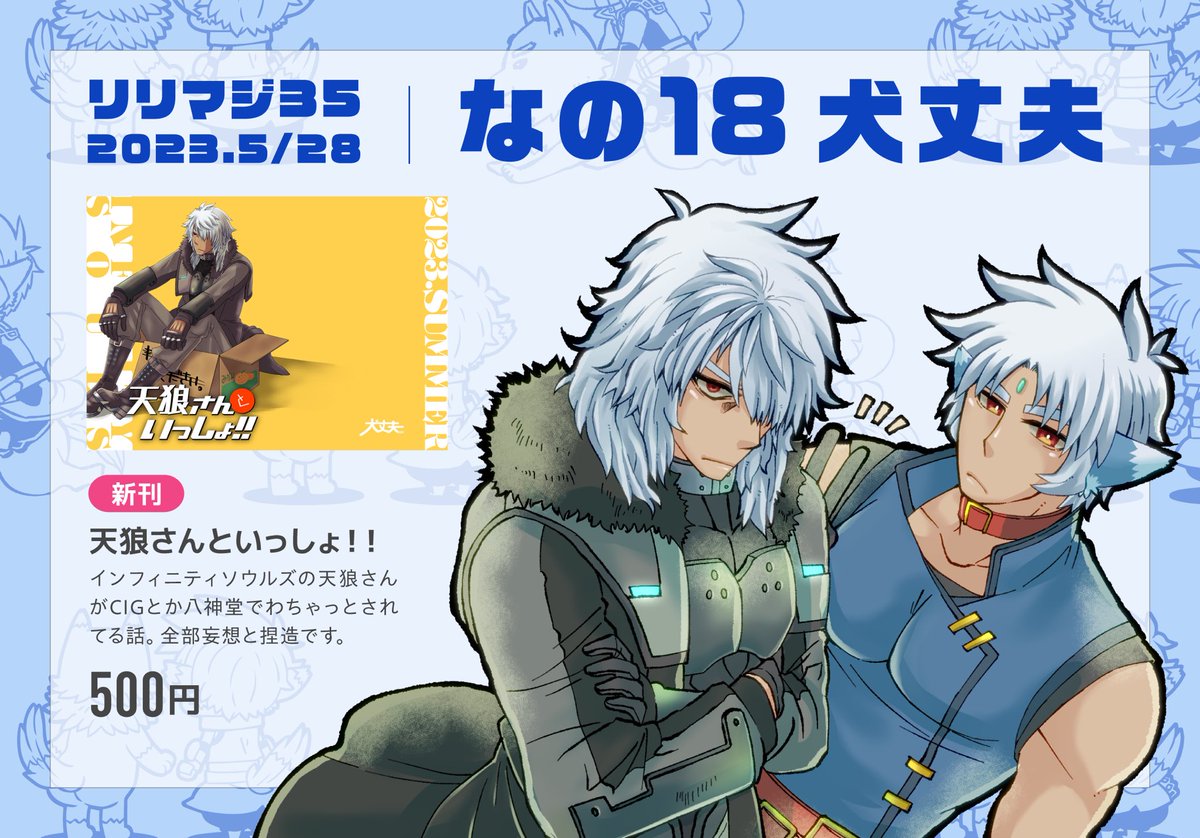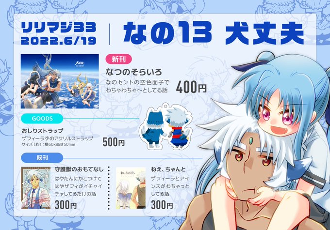 26 23 本日開催のリリマジ35お品書きです。 前の在庫が見当たらんかったので(おい)新刊のみ。天狼さんの妄想を書き殴った本がでます。天狼さんと言いつつ八神家も。 なのは-18 犬丈夫にてお待ちしております〜〜。 23/05/28 10:07