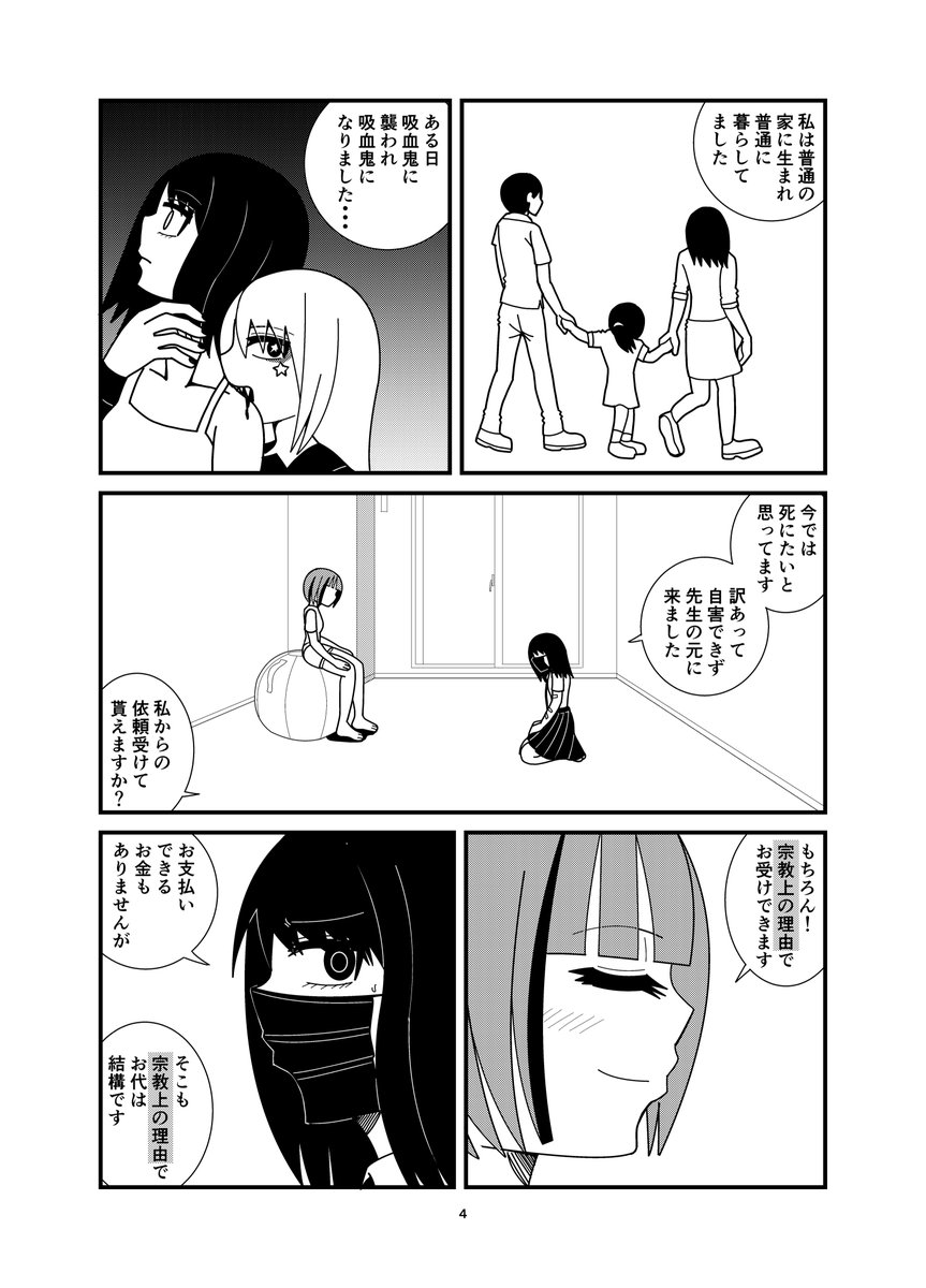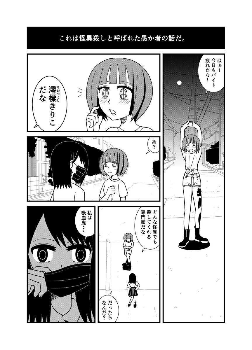 #秋の創作クラスタフォロー祭り #絵描きさんとつながりたい #漫画が読めるハッシュタグ #創作クラスタさんと繋がりたい #漫画 #創作漫画 #創作 怪異殺しと呼ばれる 専門家が 死にたい吸血鬼を 殺そうとする話です。 冬のコミティアの新刊です 年明けのコミティアで お披露目です。 お楽しみに