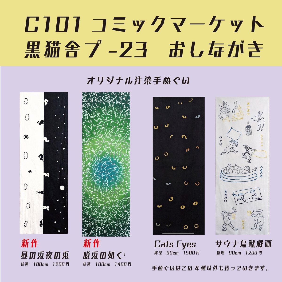 コミケのお品書き出来ました!持っていく手ぬぐいは新作多めです。これ欲しいので持ってきて!リクエストあったらメッセかリプでお願いします。1日目は東6ツ08 LeCoton、2日目は東5プ23 黒猫舎にいます。フリーペーパーも沢山用意しましたのでよろしくお願いします。#C101お品書き #手ぬぐい