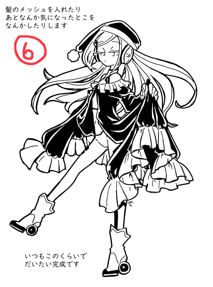 もうちょい描き加えます 今回は髪のメッシュを忘れてたので描きました 線が多い絵は丁寧で豪華ですが、 少なめでシンプルにまとまってるのも憧れます