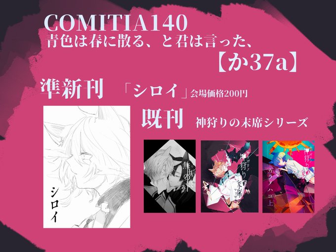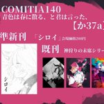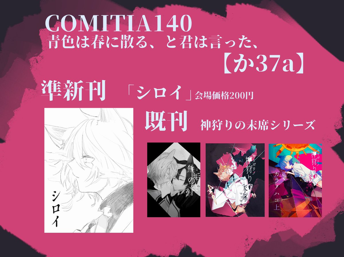#COMITIA140 「青色は春に散る、と君は言った、」は 【か37a】に配置されています。 お品書き前回の使い回しですみません。 新刊はありませんが、 弊サークル発のライバー「MiMi 憂色」の紹介ポスカ(無配)と、缶バッジのデモ頒布を致します。 こちらは限定3個になります。 よろしくお願いします!