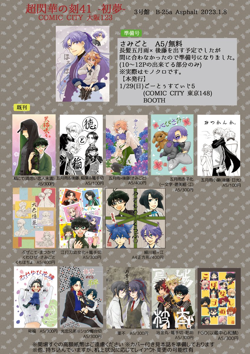 【2023年夏インテおしながき】 8/20 5号館-し27a Asphalt(五月雨スペース) 基本は夏コミと同じで、江本何種か追加で持ち込みます。 ※ごーとぅすていじ参加 ※13時完全撤収予定のため、御用の方は12時頃までにお越しください。 pixiv.net/artworks/11089…