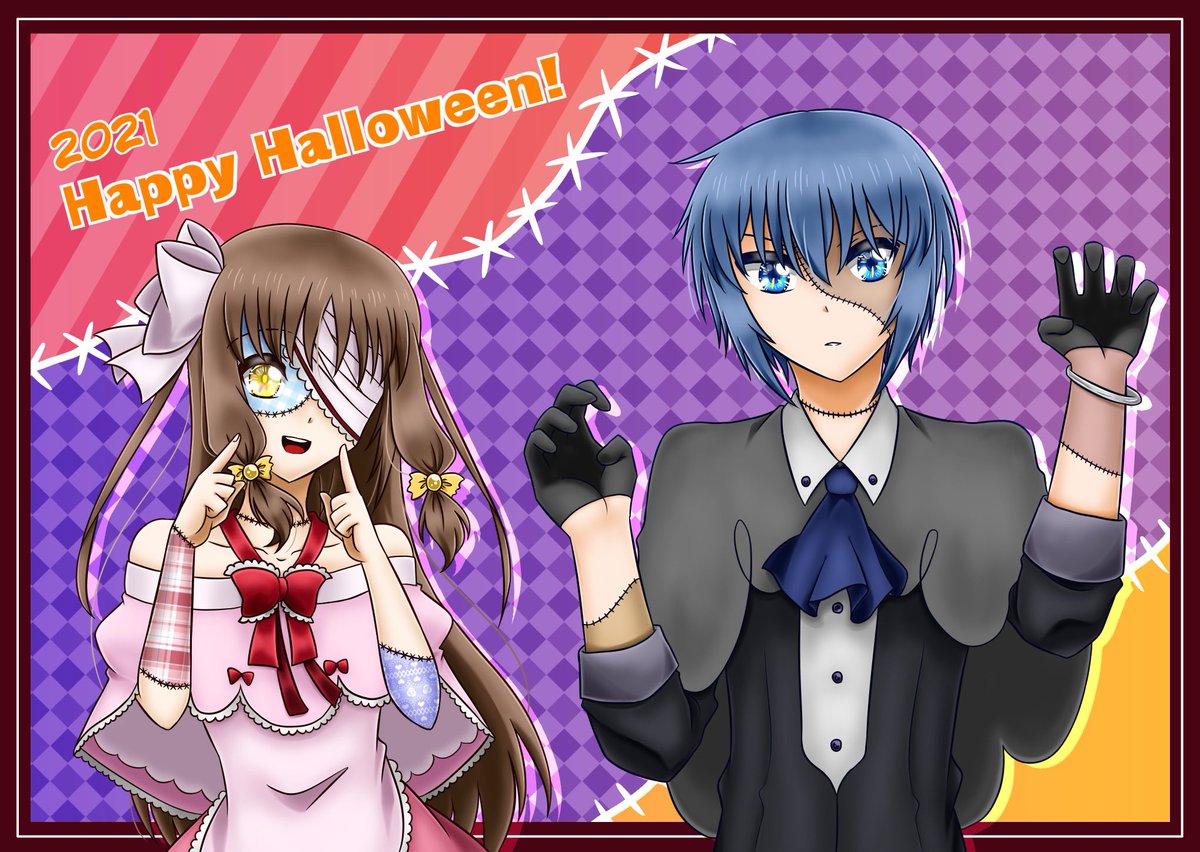 🎃👻🍭HAPPY HALLOWEEN!🍭👻🎃 シャゼリゼはぬいぐるみ、ジオルはゾンビの仮装をしてハロウィンの日に君臨! お菓子かイタズラかその両方か…! ジオルは乗り気じゃないように見えますね #ハロウィンイラスト #ハロウィンイラスト2021