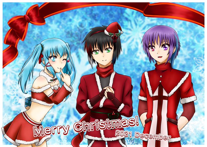 #クリスマスイラスト メリークリスマス!🎄🎁🎅🌟 左からリリィ、ヒビキ、グレンゼにクリスマス特別衣装を着てもらったよ! 今年はこの3人がサンタさん! 直接渡したいプレゼントがあるんだって! 受け取る準備は出来たかな…?