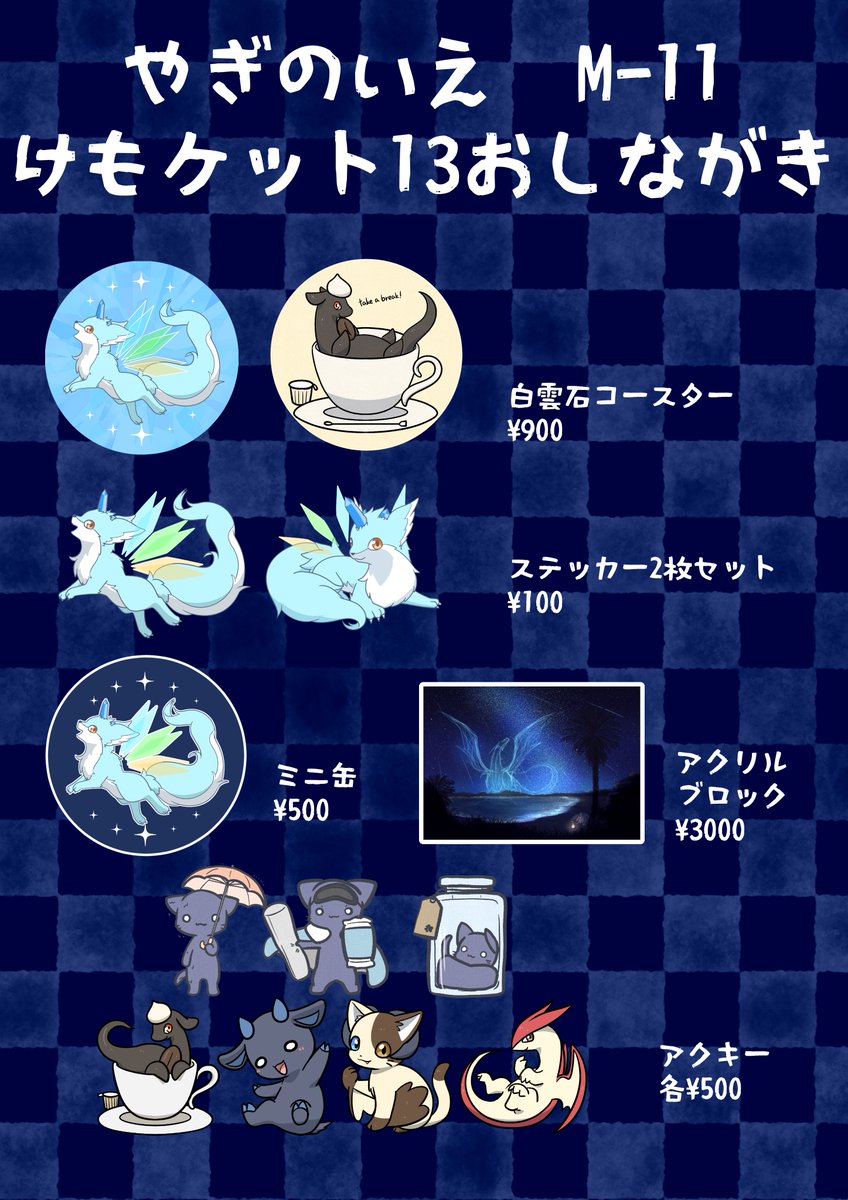 5/6けもケット13のおしながきができました! 新刊、既刊、アクキー、新刊セットは取り置きできますのでリプかDMください!