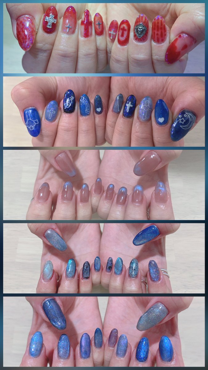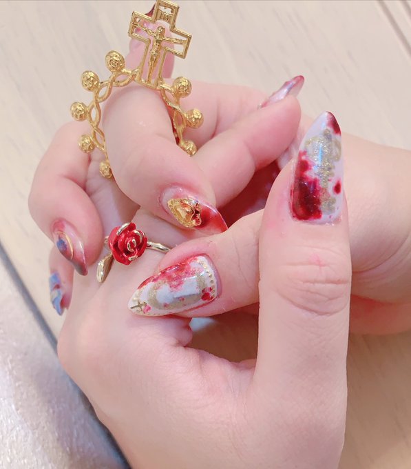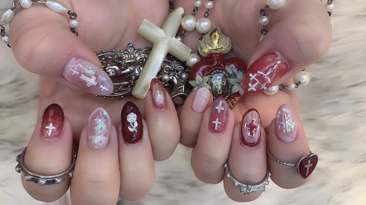 11 52 🆕💅🏻 前回思いっきり青だったので今回は赤の行き当たりばったり勢い任せネイル sigilinspiredの赤と偏光ラメ(薄いフィルム状のやつ) すぐ十字架盛る 21/02/25 23:48