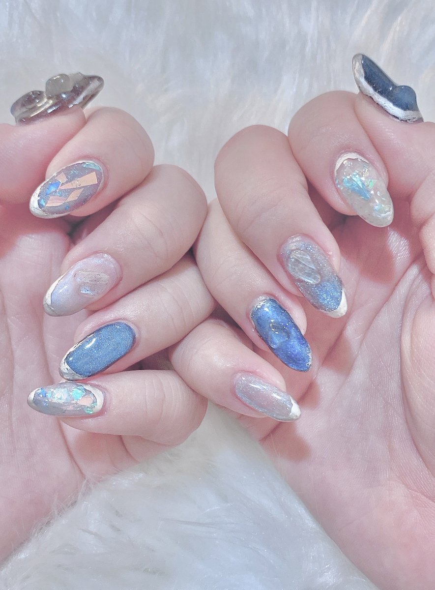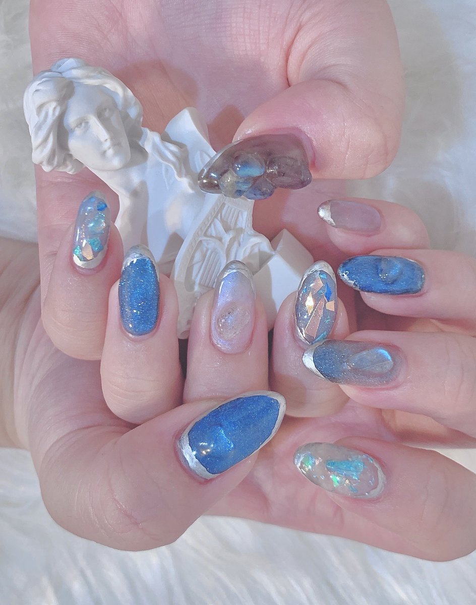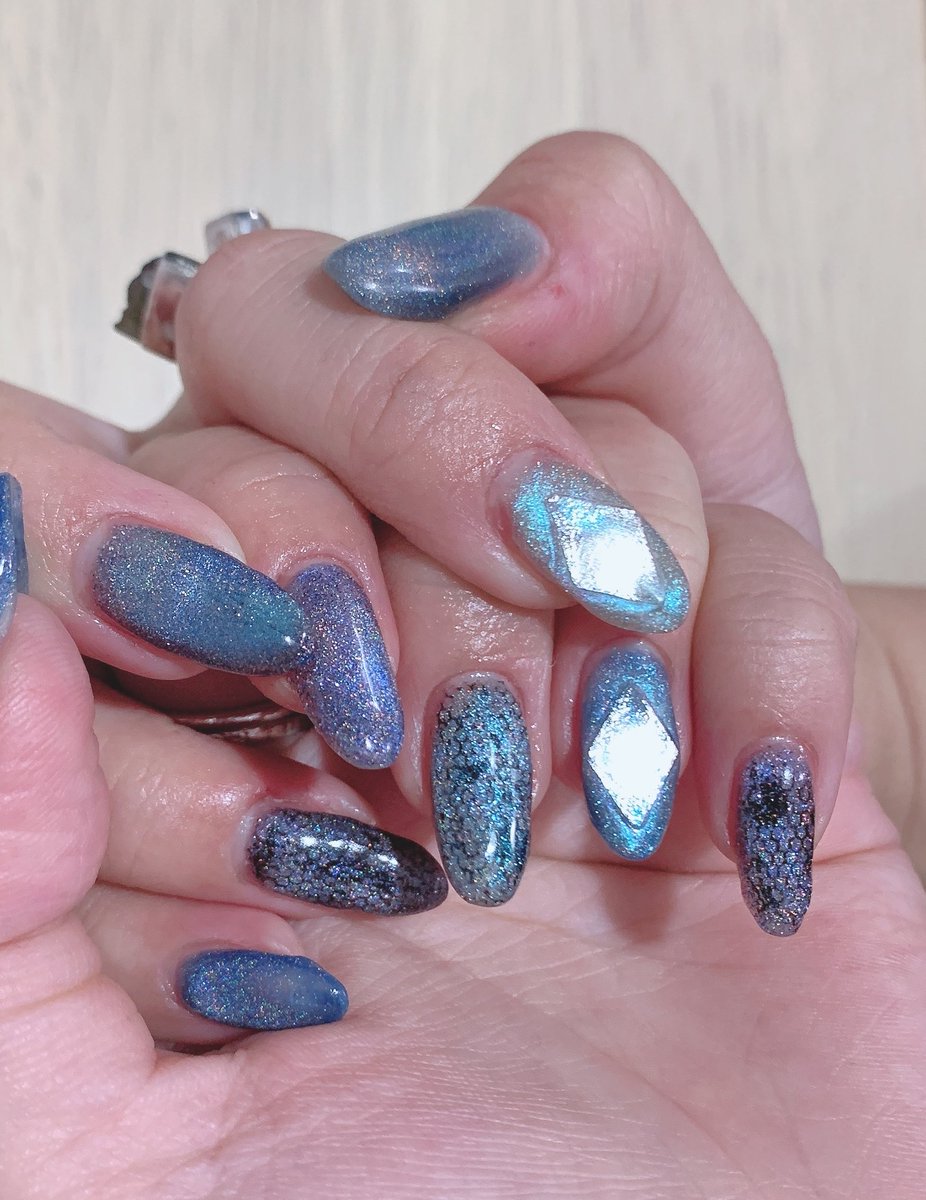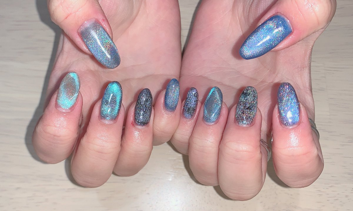 新しいネイル💅🏻 青!水色!マグネット!フィルム!ラメ!キラキラ!💎✨ ポイントはシラーが割とバシバシめなラブラドライト盛り シアーめ&ツヤ増し増し!涼しげでかわいいはず!