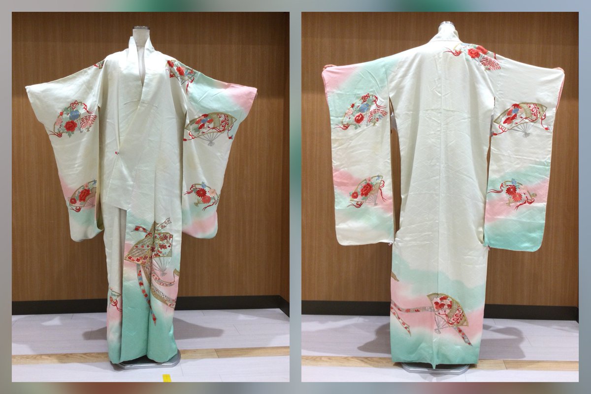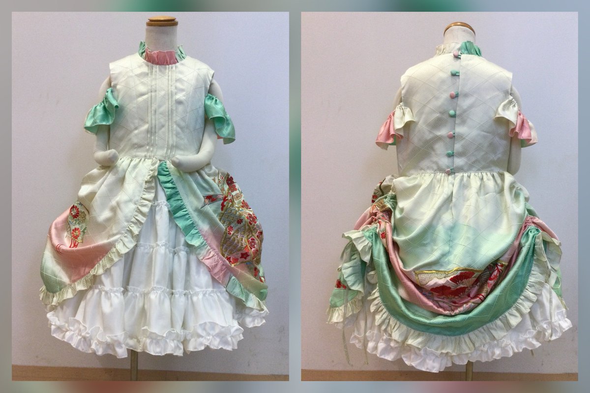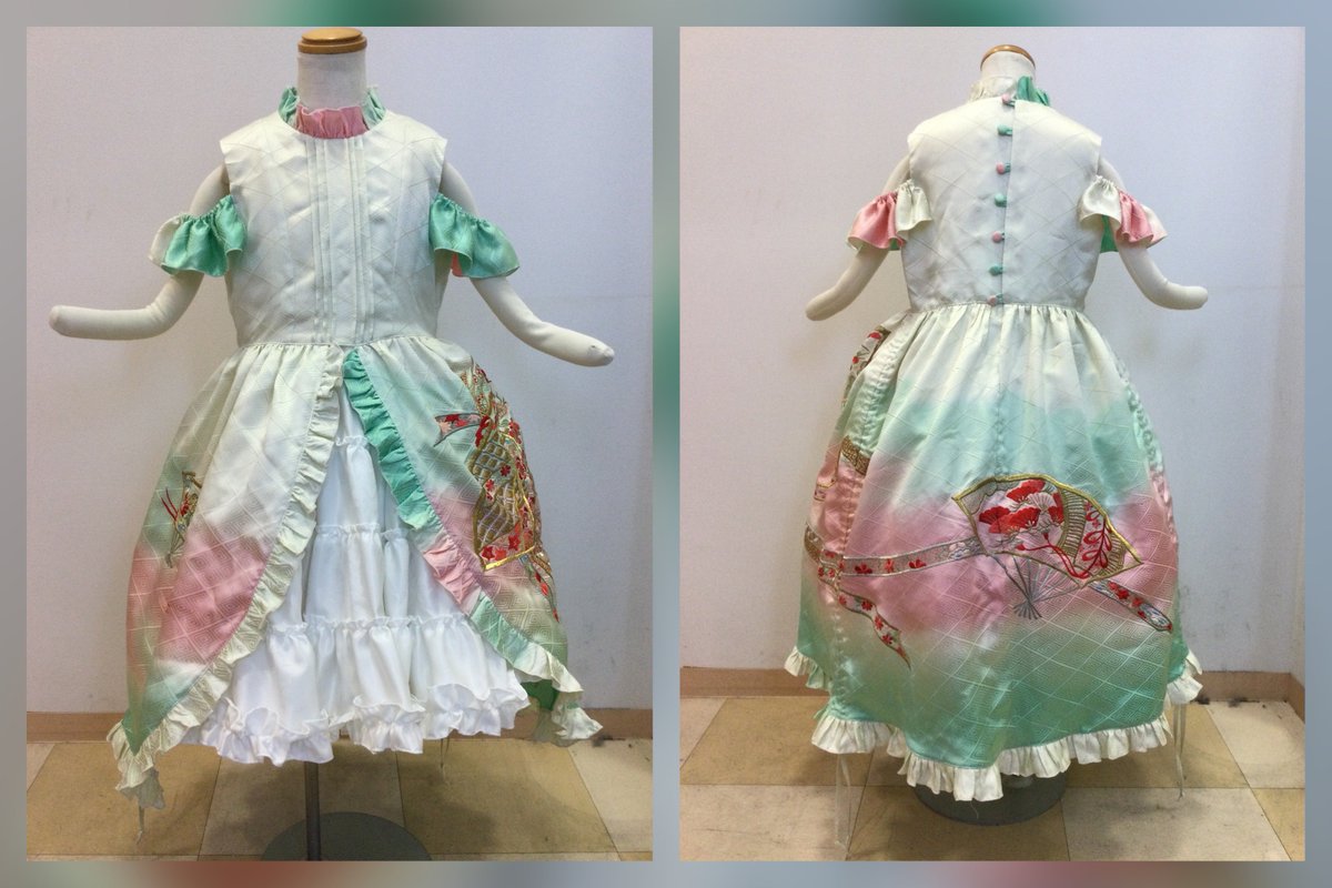 天才の仕事を見てくれ〜!!! 祖母の振袖⇨孫の七五三用ドレスにリメイク👘 裾の柄が綺麗だから全部入れるために斜めに裁断してるので中心がずれているけどどうにかいい感じになった! 脇のループを下ろして着れば柄を全部見せられるし引っ張れば短め&ドレープでデザイン変えても着れるようにした🌟
