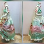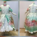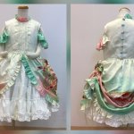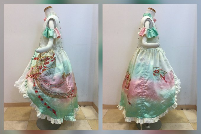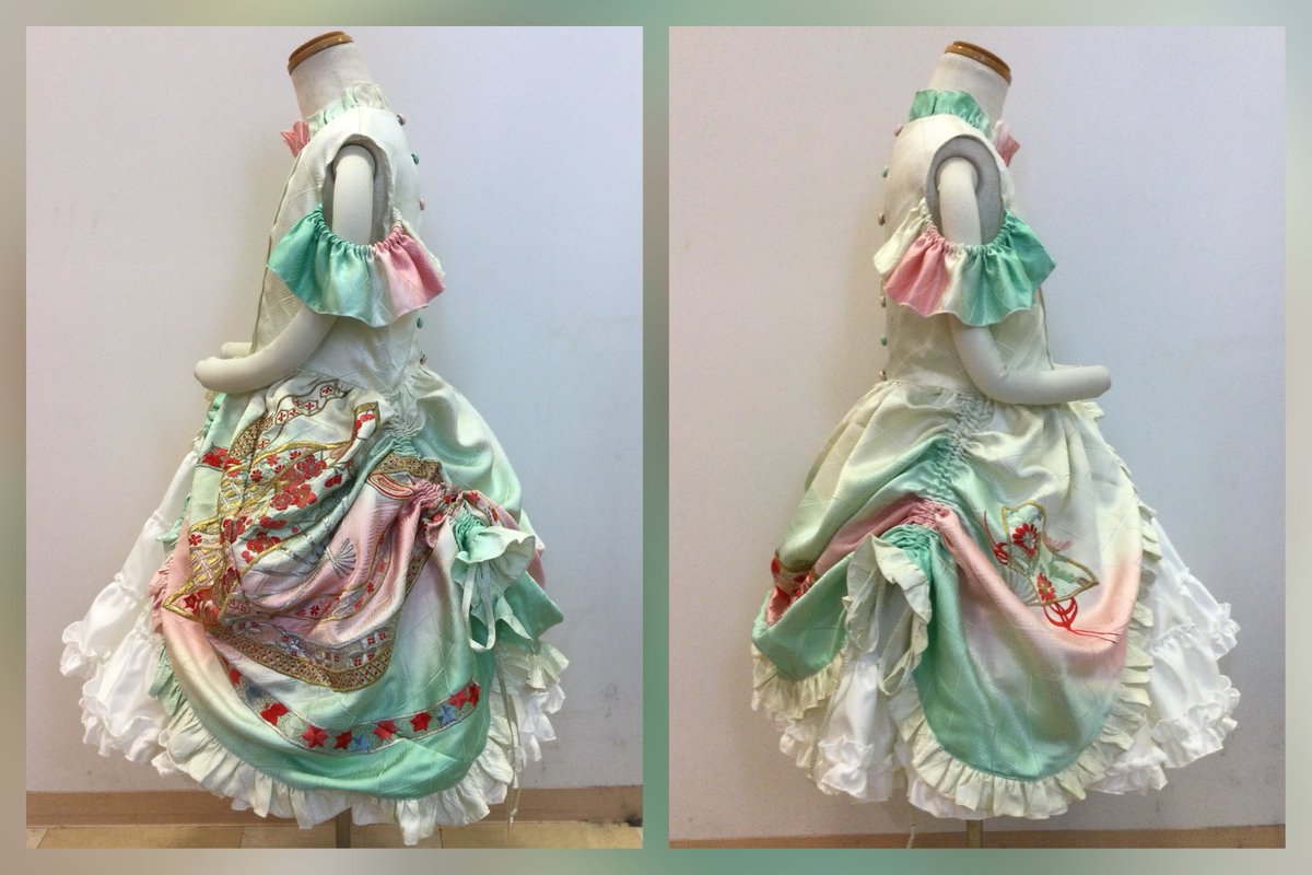 23 79 横から! パフスリーブにしようと思ったけど着る子が肩出るデザイン好きらしいので袖のようなフリルを、元の生地のグラデを上手く活かせた❣️ 共布で作ったくるみボタンも可愛い 下に履かせてるスカートは長襦袢一着丸々使ってボリューム多めでフリフリに あとは帯で飾りリボン付きのベルトを作るかも? 22/06/15 22:39