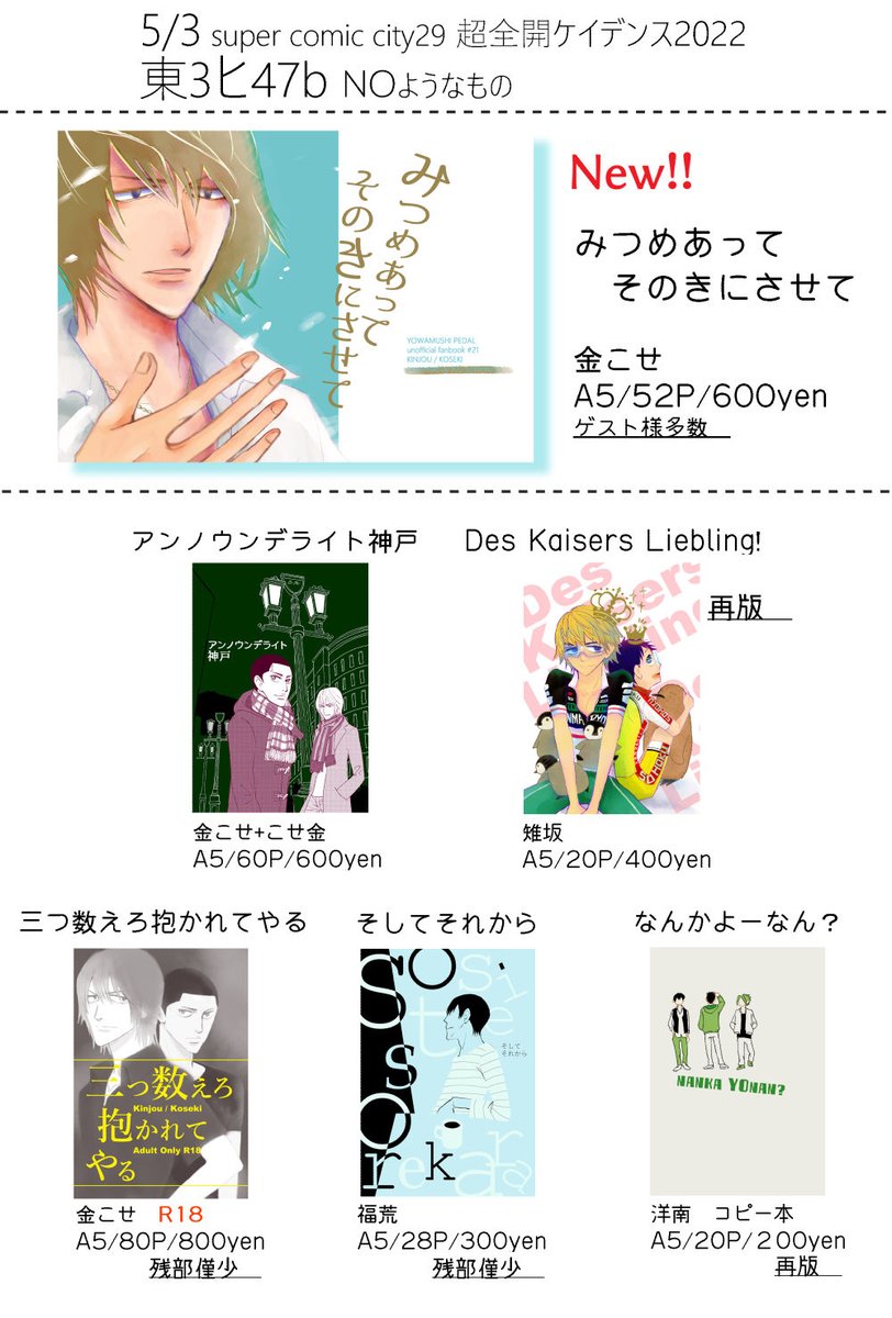 21 30 超全開ケイデンスの新刊サンプルとお品書きです 新刊は金城と小関さんが神戸で会ったり千葉の海岸で石投げしたりする金こせです。全年齢ですが恋愛要素あり。ゲストおよびしてます! 既刊は5種持って行きます。【ヒ47b】でお待ちしてます~ヨロシク! 22/04/30 20:29