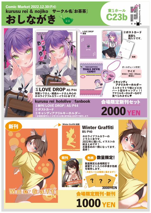 40 174 コミケのお品書きです❕ 東1ホールC23b 『お茶茶』 自分は、姫森ルーナさん・常闇トワさん中心のホロライブ本を出します! 下はノジコさん(@n__g___2 )です。 #C101お品書き #C101 22/12/24 17:52