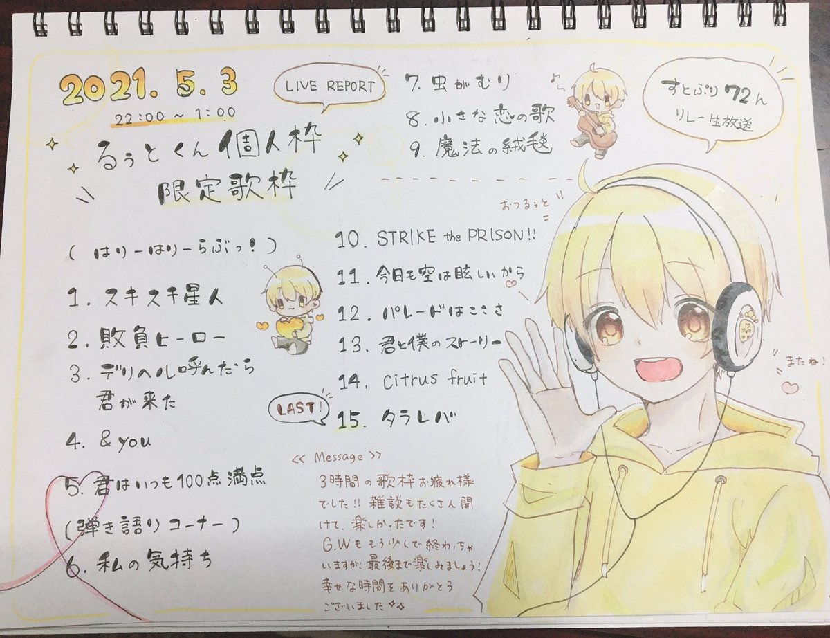 るぅとくん! 久々の歌枠お疲れ様でした! とても楽しかったです✨ 最後のタラレバは、聞いてる私も懐かしく、離れ難いなと思うエモい気持ちになっちゃいました!w 残りのリレー生放送も頑張ってください✨楽しみにしてますね!! #すとぷり72時間リレー生放送 #すとぷりギャラリー #るぅとくん