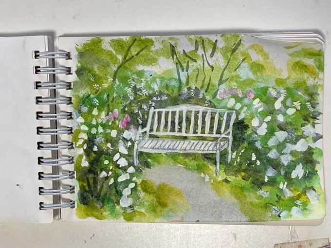 1 3 #リベンジしてみたシリーズ。ベンチを練習してからまた描いてみました。#横浜イングリッシュガーデン #水彩画 #ダーウェント #胡粉ジェッソ 21/05/15 21:26