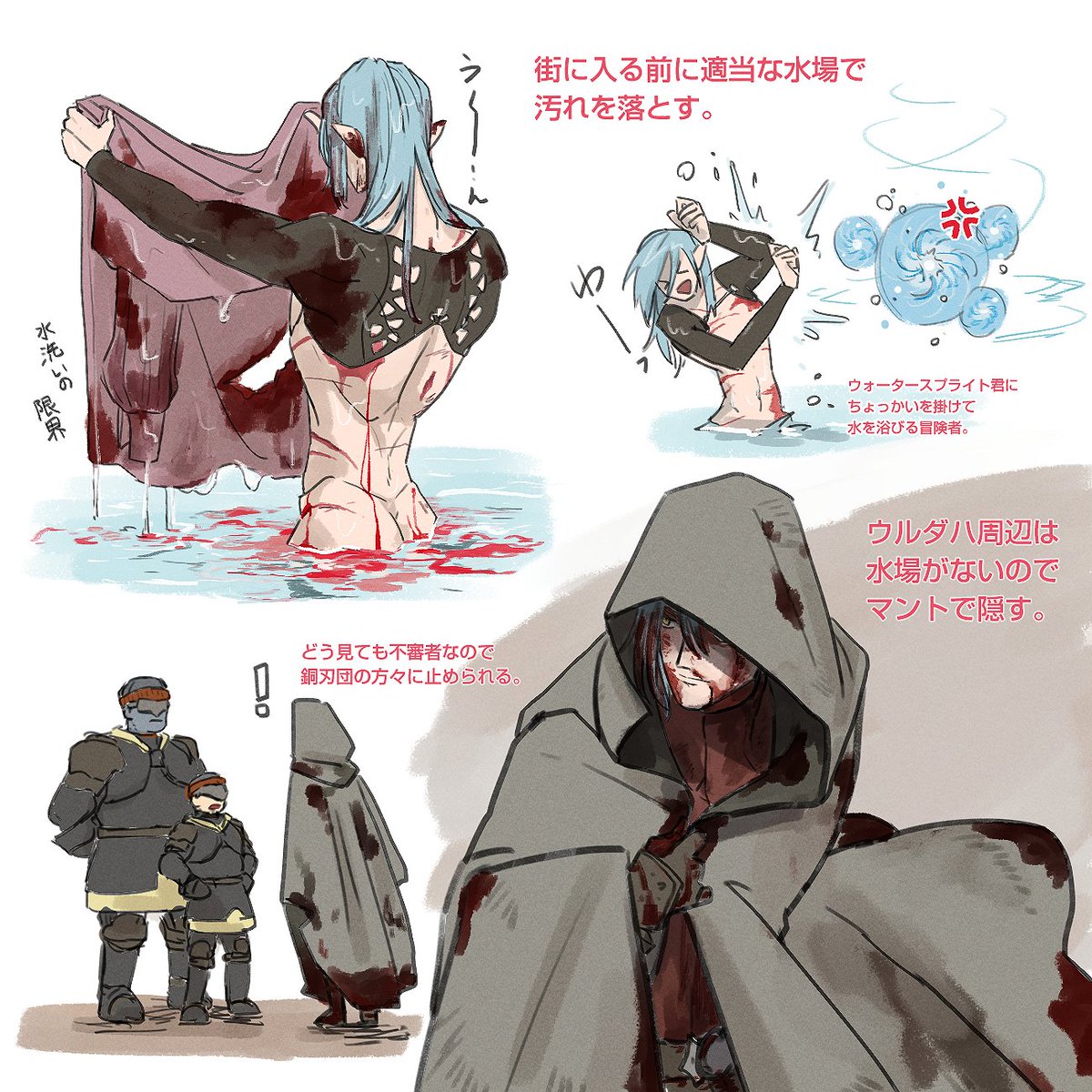 ドロドロに汚れたままの状態で街には入れない(と思う)ので、そのへんの川とか適当な水場で汚れを落としたりするのかな、のメモ。 冒険者がよく出入りするような街には冒険者専用洗い場とかあるといいな。 twitter.com/kurumi_kuun/st…