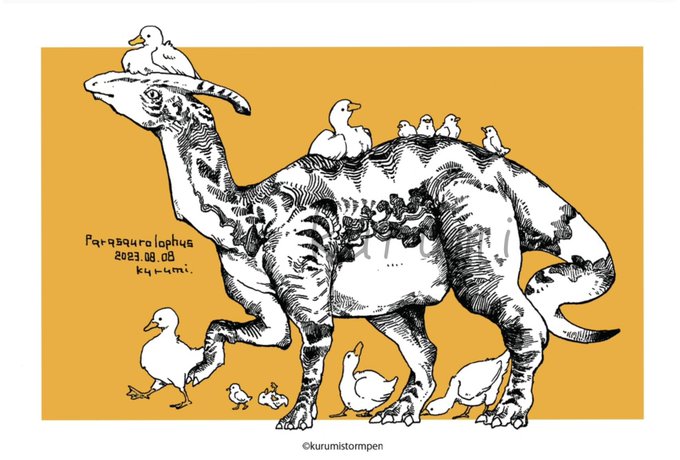 21 110 パラサウロロフスとアヒル🦆 あっちの水辺までご案内します🦕 #ペン画 #アナログイラスト #恐竜 23/08/09 20:14