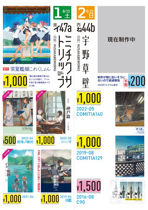 お品書き…というか印刷・分割して卓上に掲げたいので縦長仕様だけど、C102両日の出し物はこんな感じです。WEBカタログの方にもまとめています。 1日目 艦これ 東イ-47a ミチクサトリップ webcatalog.circle.ms/Perma/Circle/1… 2日目 創作(少年) 西ね-44b 宇野草壁 webcatalog.circle.ms/Perma/Circle/1… #C102 #C102お品書き