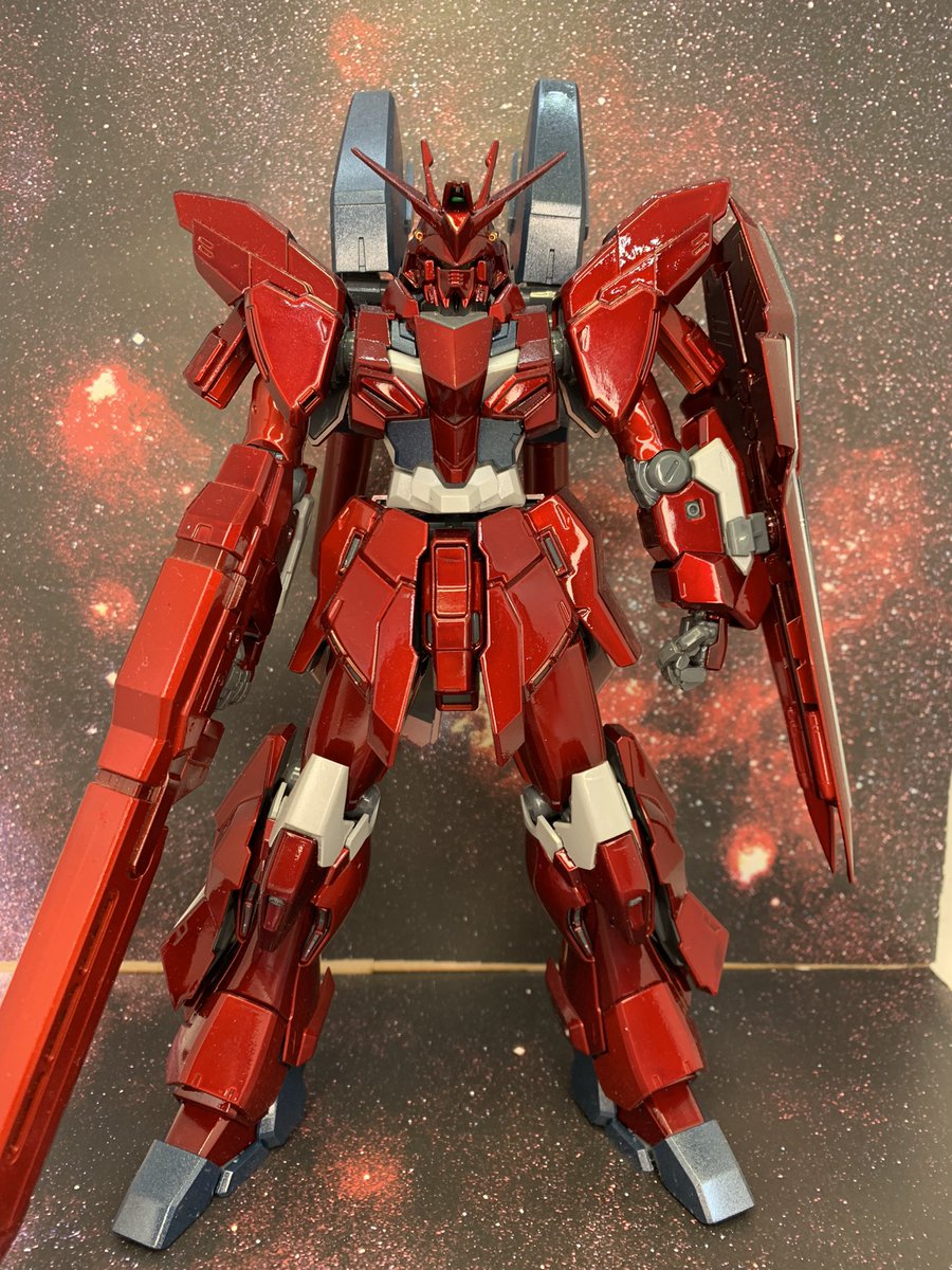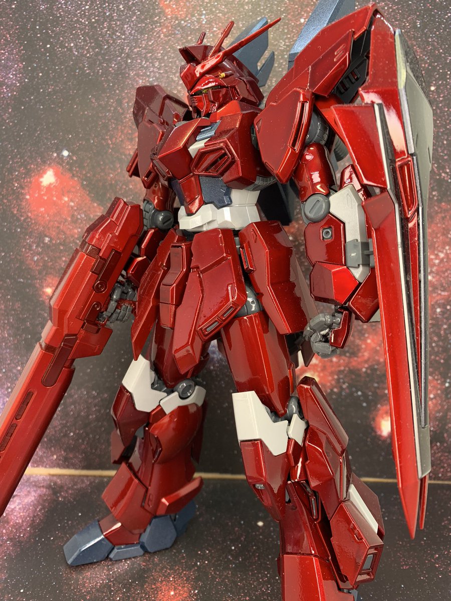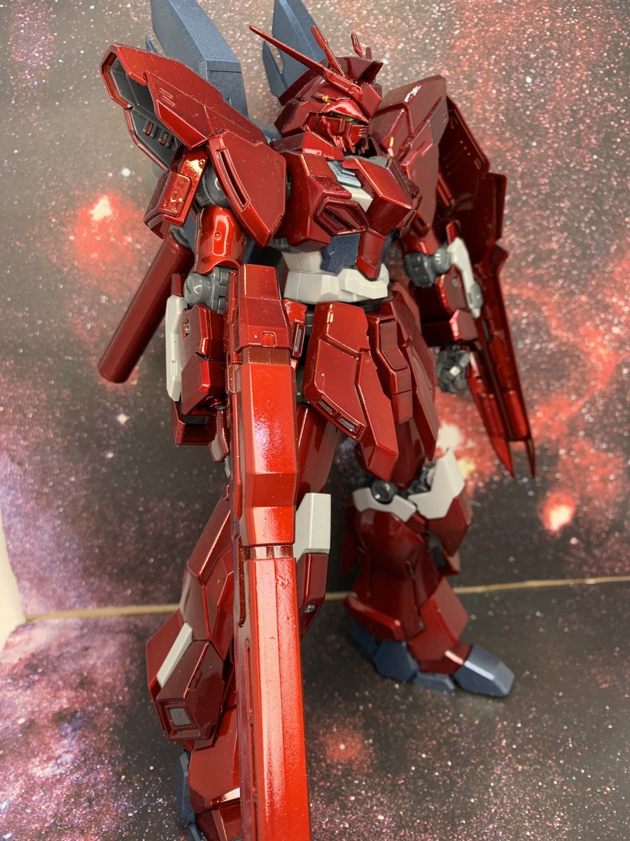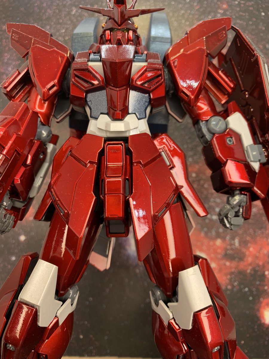 #今年作ったプラモ晒そうぜ #ガンプラ オレ設定シャア専用シナンジュガンダム。MGのシナンジュスタインをキャンディ塗装して食玩のマシンヘッドハイニューの頭をちょっと加工して乗せてます