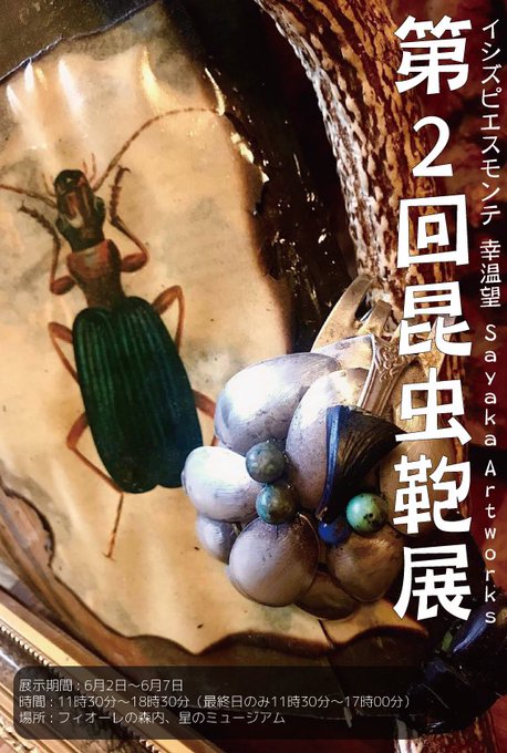 5 6 【拡散希望】 6月に展示します! 「第2回昆虫鞄展」 期間、6/2~6/7 時間、11:30~18:30(最終日のみ~17:00まで) 場所、各線溝の口駅、フィオーレの森内、星のミュージアム 告知が遅くなりすみません。私はドローイング4枚、キャンバス作品3枚、新作を出します。皆様のお越しをお待ちしております。 22/05/26 16:24