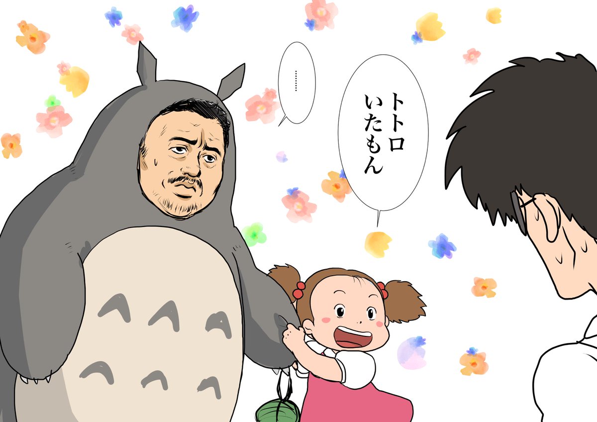 タケヒサのリクエストで @tkhs55 トトロの着ぐるみを着たマドンソクを連れてくるメイ 描きました 森の中に昔から住んでるしお土産にドングリくれるんだよ