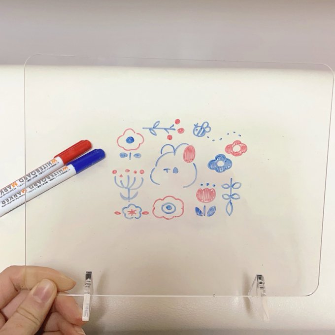 2 13 透明ボードにホワイトボードマーカーでお絵描きしました。 消して何度も書けるので楽しいです✨ 23/03/05 21:28