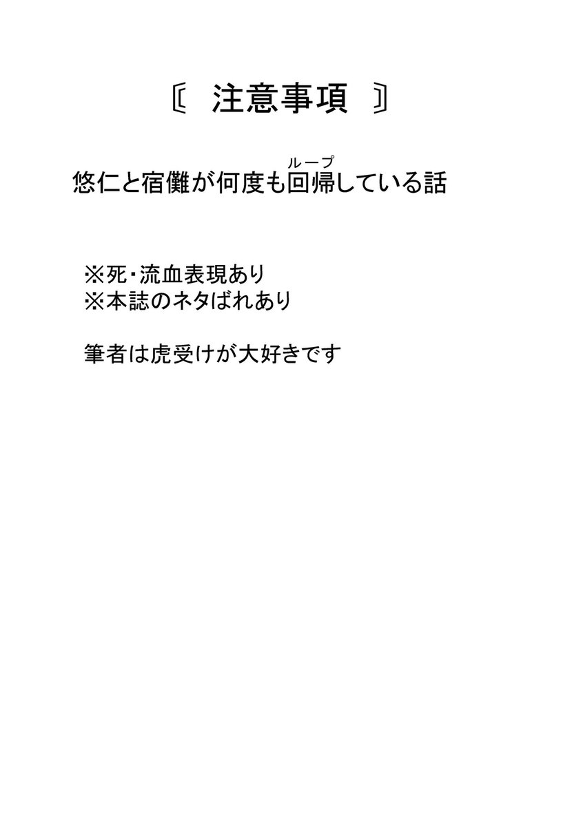 6/25 宿虎 新刊サンプル 「何百回目の最終章」 A5/38頁/¥400 2人が何回もループしてる話 ⚠️死.流血の表現あり、本i誌ばれあり 結構暗めです、ハピエンのつもり 冒頭部サンプル→ pixiv.net/artworks/10908…