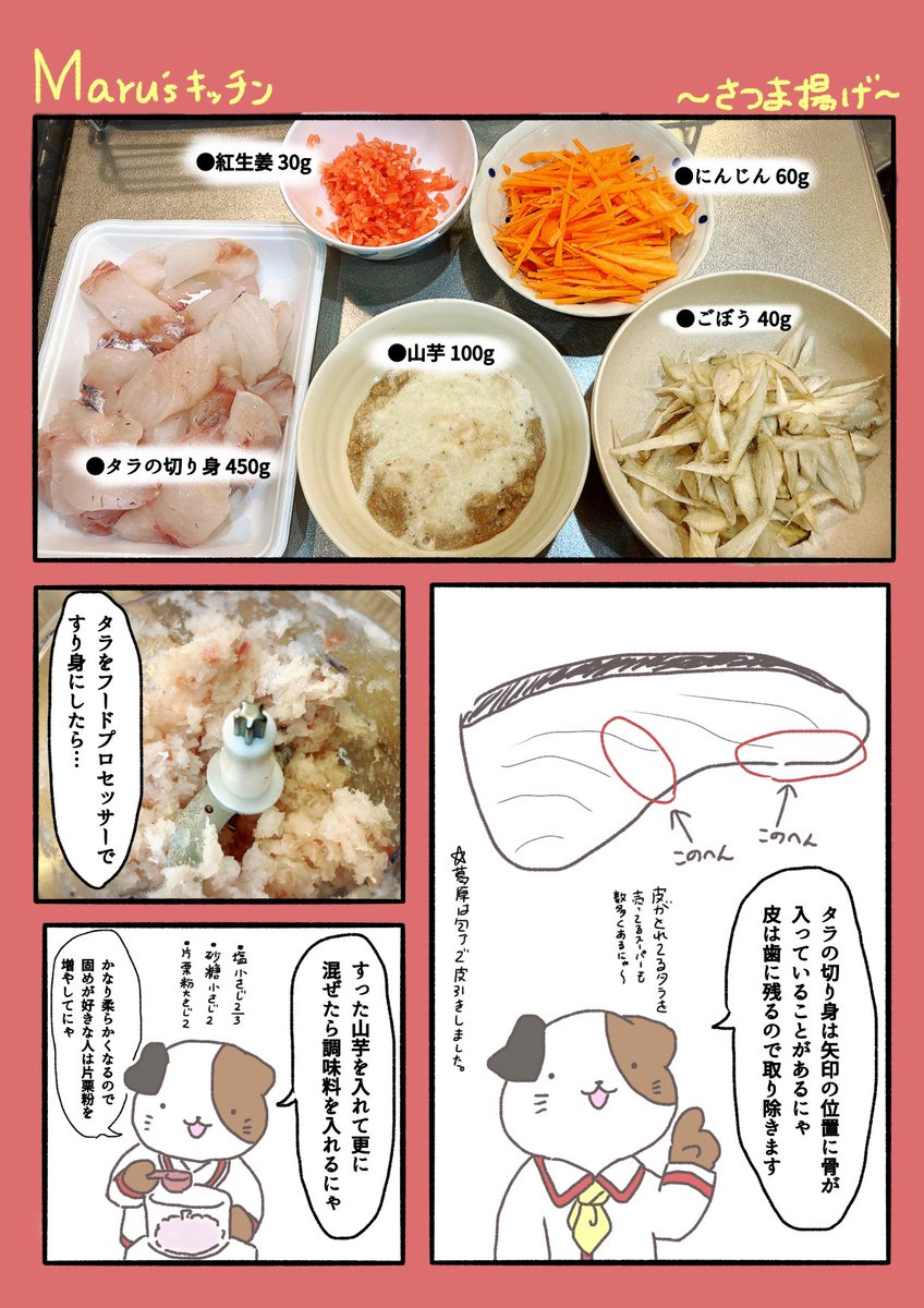〜にゃん丸キッチンさつま揚げ編〜 魚屋やってたんで魚料理でこれいいなーってレシピ出来たら描こうかなと思ってます🐟 魚の捌き方とかよりかは簡単かつ美味しいレシピの方がいいのかなどうなんだろ。模索中です。 #漫画が読めるハッシュタグ #創作漫画 #創作好きさんと繋がりたい