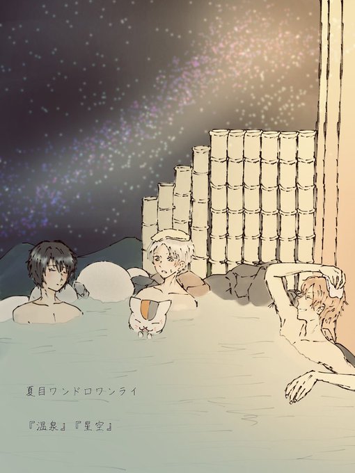 #夏目ワンドロワンライ 『温泉』『星空』 夏目、ニャンコ先生、田沼、柴田でまた仲良く出掛けてほしいな〜と言う願望があります。ニャンコ先生は温泉の湯飲んでます。やっちゃダメらしいです♨️