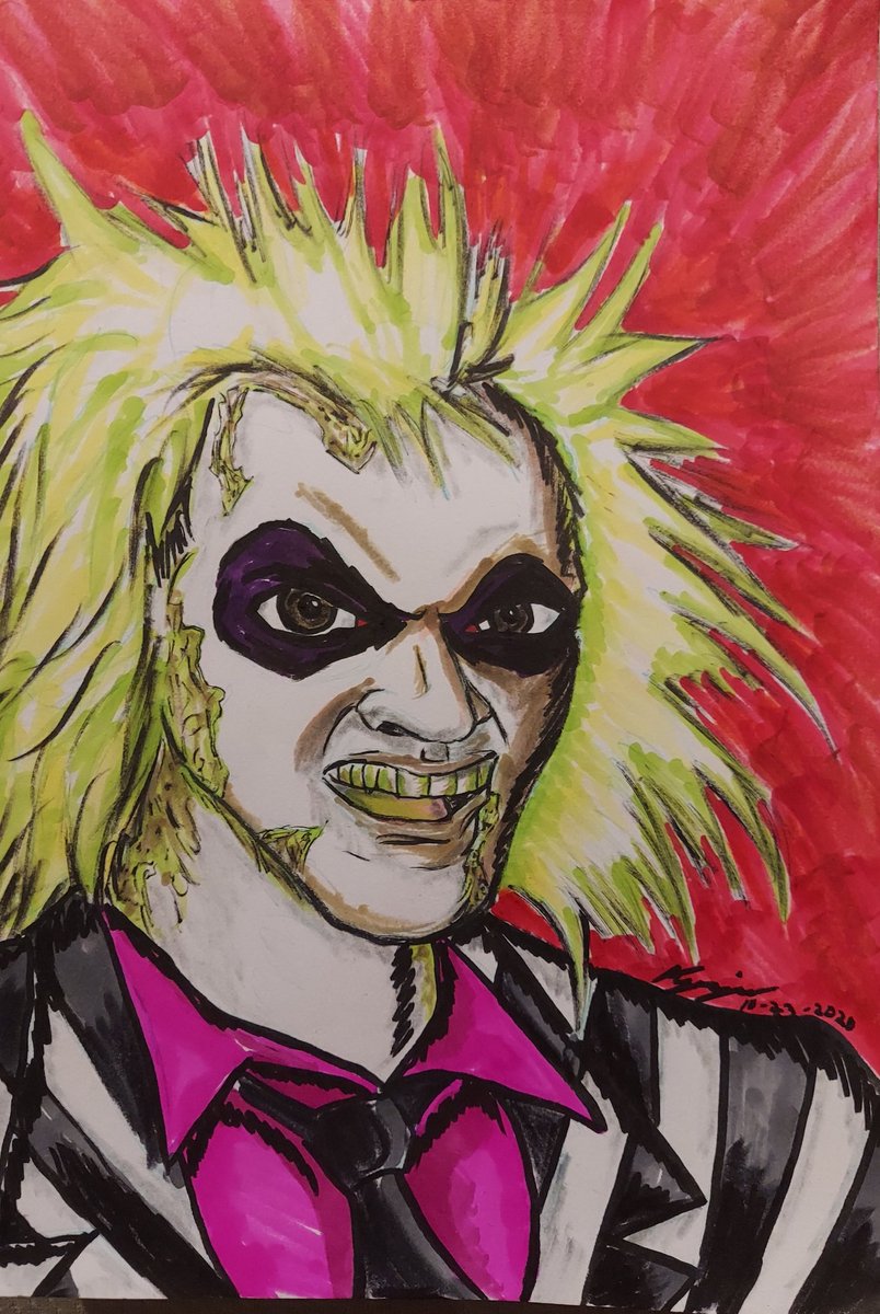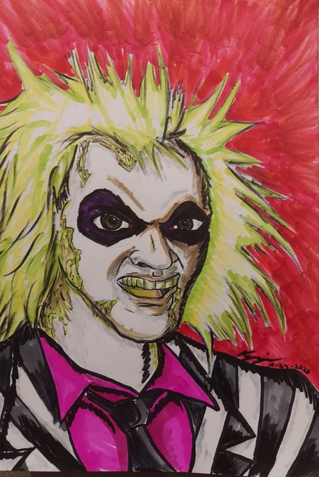 "It's showtime." Got a suggestion from a friend for this one. I don't usually think of #Beetlejuice as a bad guy since I knew the cartoon first (homaged with the shirt,) but in that movie? He was a prick! So I'd say he's more than earned his spot! #Villaintober #inktober2020