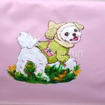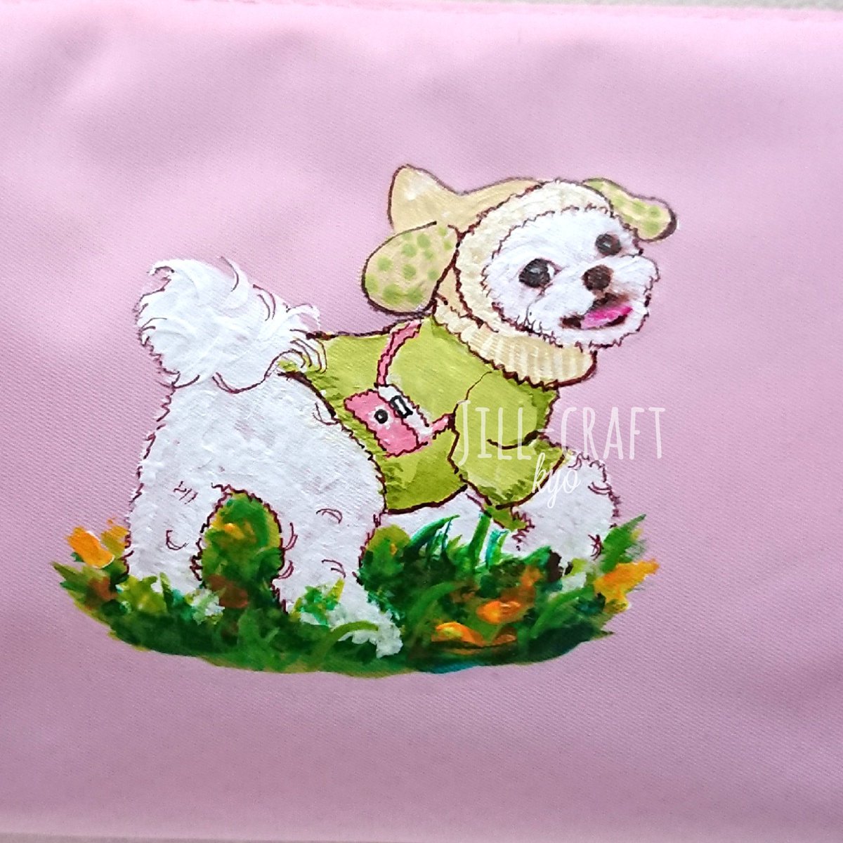 おはようございます😆💕✨ 今日は洗濯日和。気持ちよく、ありがたいです。 虹色リボンでハンドルを付けたポーチに今回はマルチーズちゃんを描きました。 ウサギのお人形をポケットに入れた子たちと、被り物の子 #minneクリスマス2022 #マルチーズ #minne minne.com/items/34708771