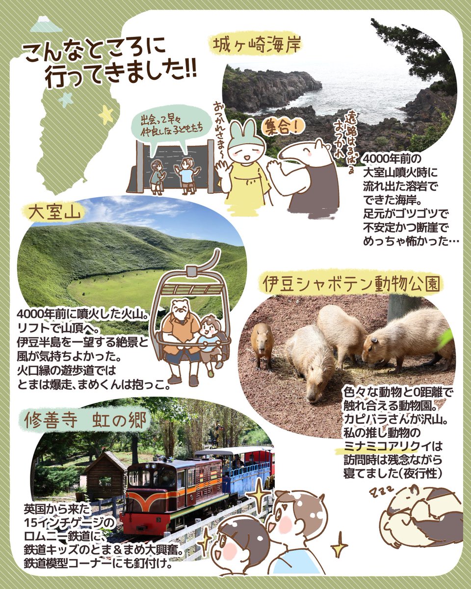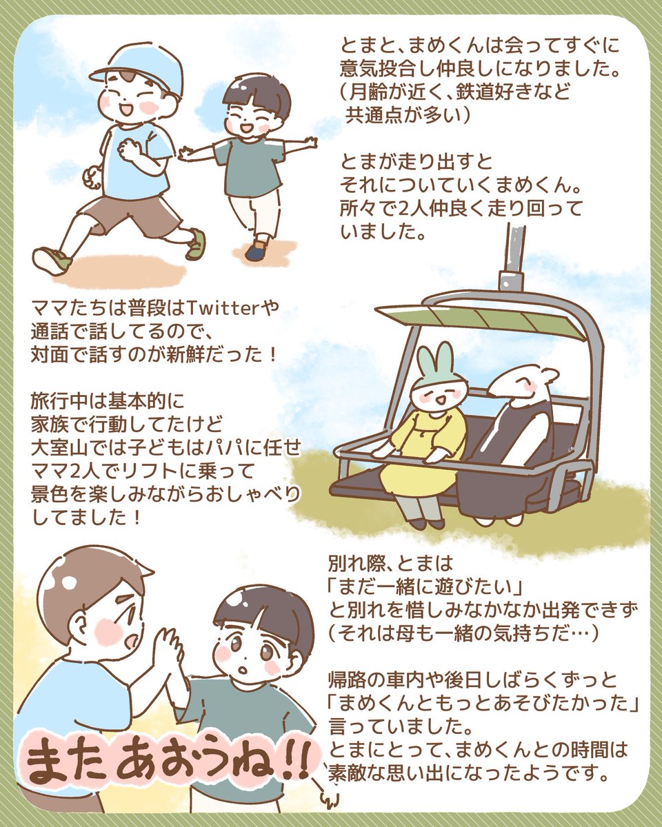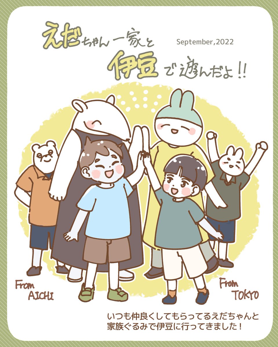 0 2 えだちゃん(@eda_mamemama )と、9月に家族ぐるみで伊豆で遊びました😆折角なので簡単な旅行記を描きました📝 住まいが離れてたので遂にお会いできたことが嬉しく、子ども同士も仲良く遊んでくれたので、ママたちは微笑ましくニヤニヤしてました😁 また遊びましょ✨ #育児絵日記 22/11/10 20:00