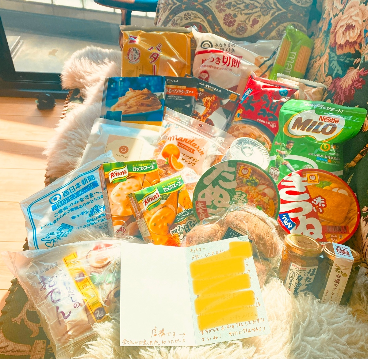 うたぴー(@uta914)に誕生日に何欲しい?て聞かれて「実家仕送りセット貰ったことないから憧れてる!」って言ったらめちゃくちゃリアルな設定の手紙付きで送られてきた🎁