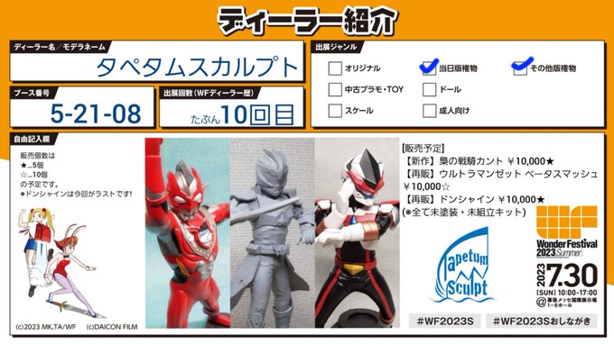 【再販】 ドンシャイン ¥10,000 販売個数:5個 再販は今回でラストです。シャインブレーダーをイメージしたベースが付属します。 ご興味ありましたら、ぜひこの夏にドンドンよろしくお願いします~!💥 #WF2023S #WFおしながき #ドンシャイン #ウルトラマンジード twitter.com/kyon0828/statu…
