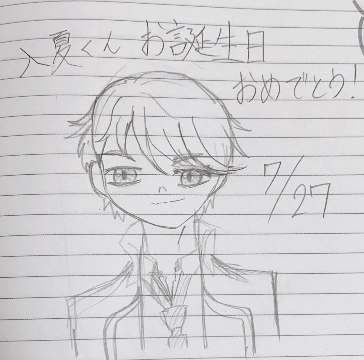 0 5 いりなつくんお誕生日おめでとう🎊 これは14歳いとこ♀に描いてもらったまししくんお誕生日絵です かっこいいし目力があるし初見で髪型描くの上手い…輪郭がかわいい… 21/07/27 01:19