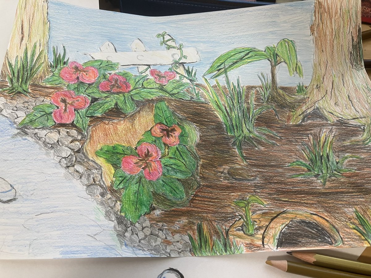 いまどうしてる? A夏休みの宿題を 眺めてる。 ツイートってこれでいいよね? よくわからん。 人を描いたら化け物になったから 100円色鉛筆でお絵描き🖍 #絵 #風景画 #色鉛筆 #お絵描き
