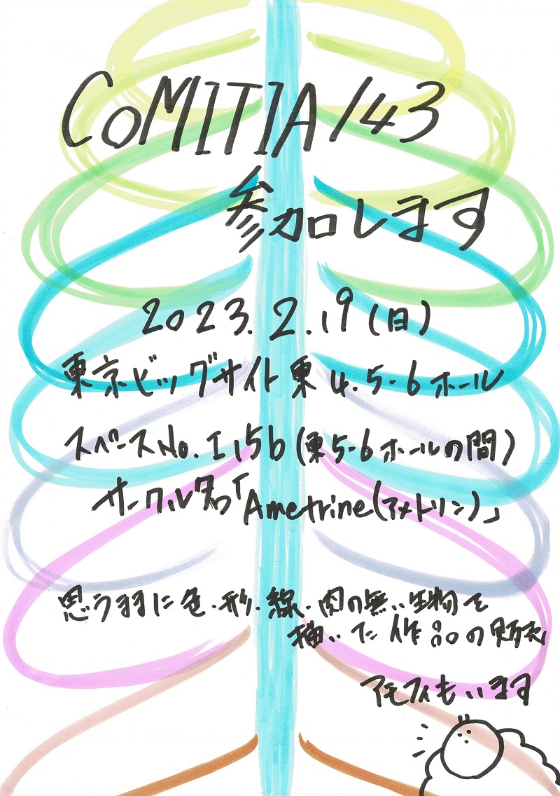 【イベント参加情報】 『COMITIA143』 〇日時 2023/2/19㈰ 11:00~16:00 〇場所 東京ビッグサイト 東4・5・6ホール サークル名『Ametrine(アメトリン)』で参加します。 スペース№I15bです #COMITIA143 #コミティア143