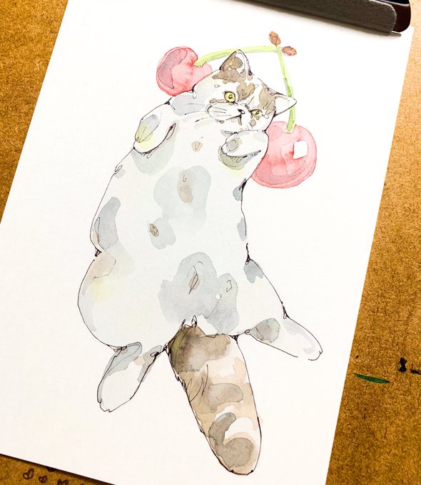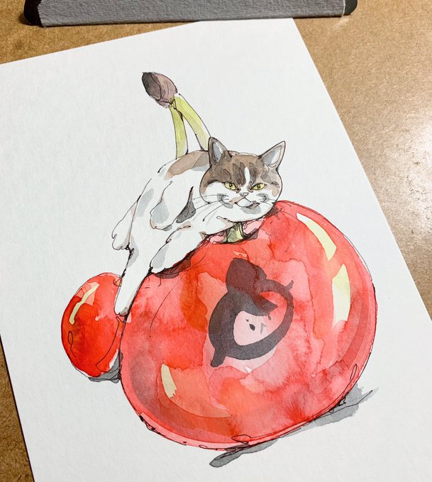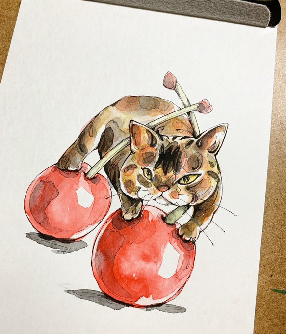 3 29 これくらいの抜け感がいいな🍒 #art #drawing #illustration #ドローイング #イラスト #アート #cat #猫 #ねこ #ネコ #カラーインク #ボールペン #墨 #水彩 #絵 #さくらんぼ #Cherry #猫とさくらんぼ展 #ハイツくろねこ 23/05/14 23:47