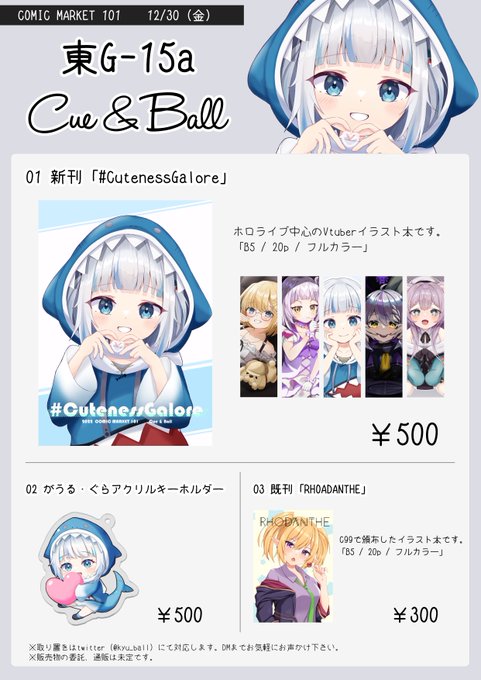 C101で頒布する予定の新刊「# CutenessGalore」の表紙です!! ホロライブ中心のVtuberイラスト本です。 (B5 / フルカラー / 20P / 500円) Gawr Gura(がうる・ぐら)ちゃんのアクキーも出ます! お品書きは後日投稿します よろしくお願いします!! #C101 webcatalog-free.circle.ms/Circle/16802574