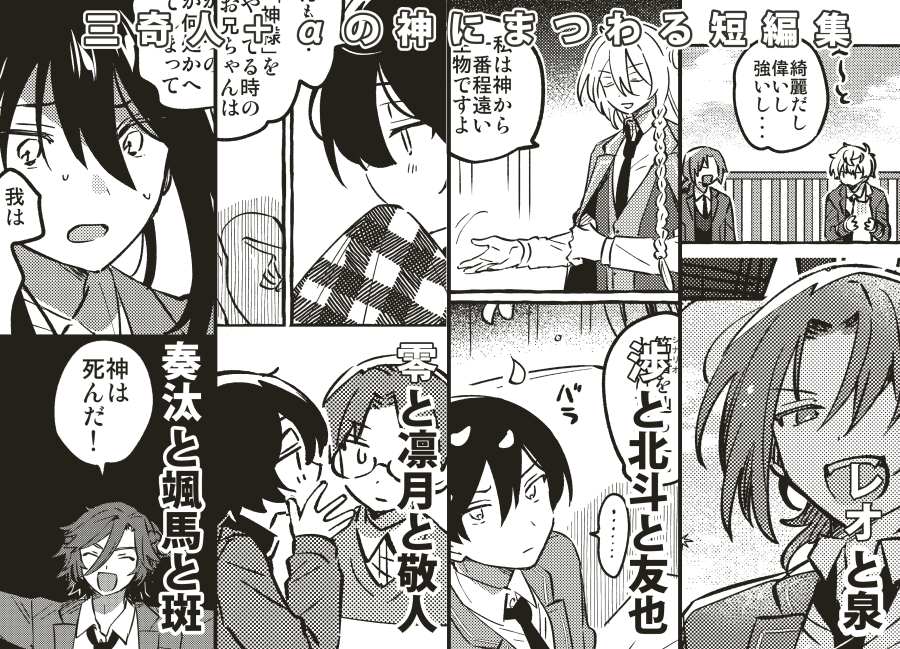 5月3日ブリデの新刊 三奇人+月永レオと各々の関係者が神様に対峙する短編集 全年齢CP無しズ!軸48P 奏汰と颯馬と斑/零と凛月と敬人/渉と北斗と友也/レオと泉 で関係性の無い別々の話 虎(通販)ec.toranoana.jp/joshi_r/ec/ite… p(サンプル)pixiv.net/artworks/10759…