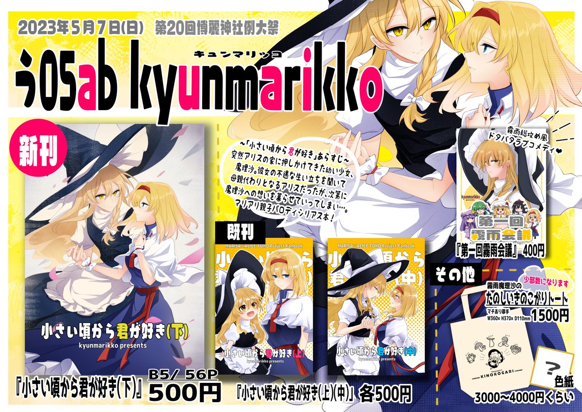 『小さい頃から君が好き(下)』 本文56P/B5/500円 「自分の気持ちが魔理沙を苦しめている」そう考えたアリスは魔理沙の前から姿をくらましてしまう。それでも手を差し伸べる魔理沙にアリスが出した答えは── マリアリ親子パロディ本,今作で完結! 5月7日(日)の第20回博麗神社例大祭にて頒布予定です