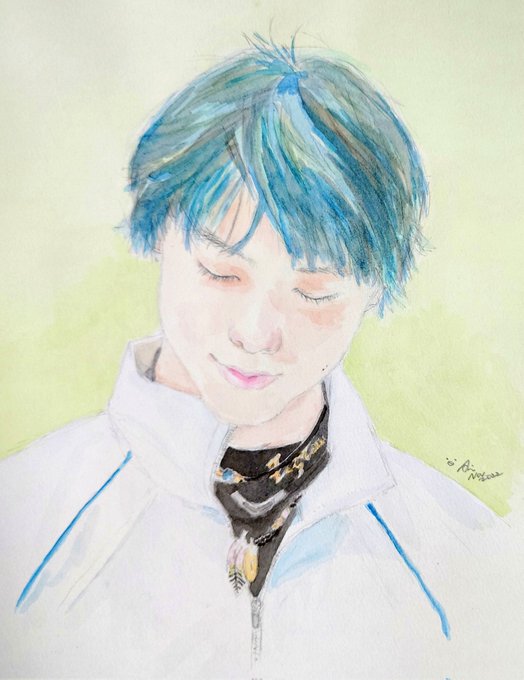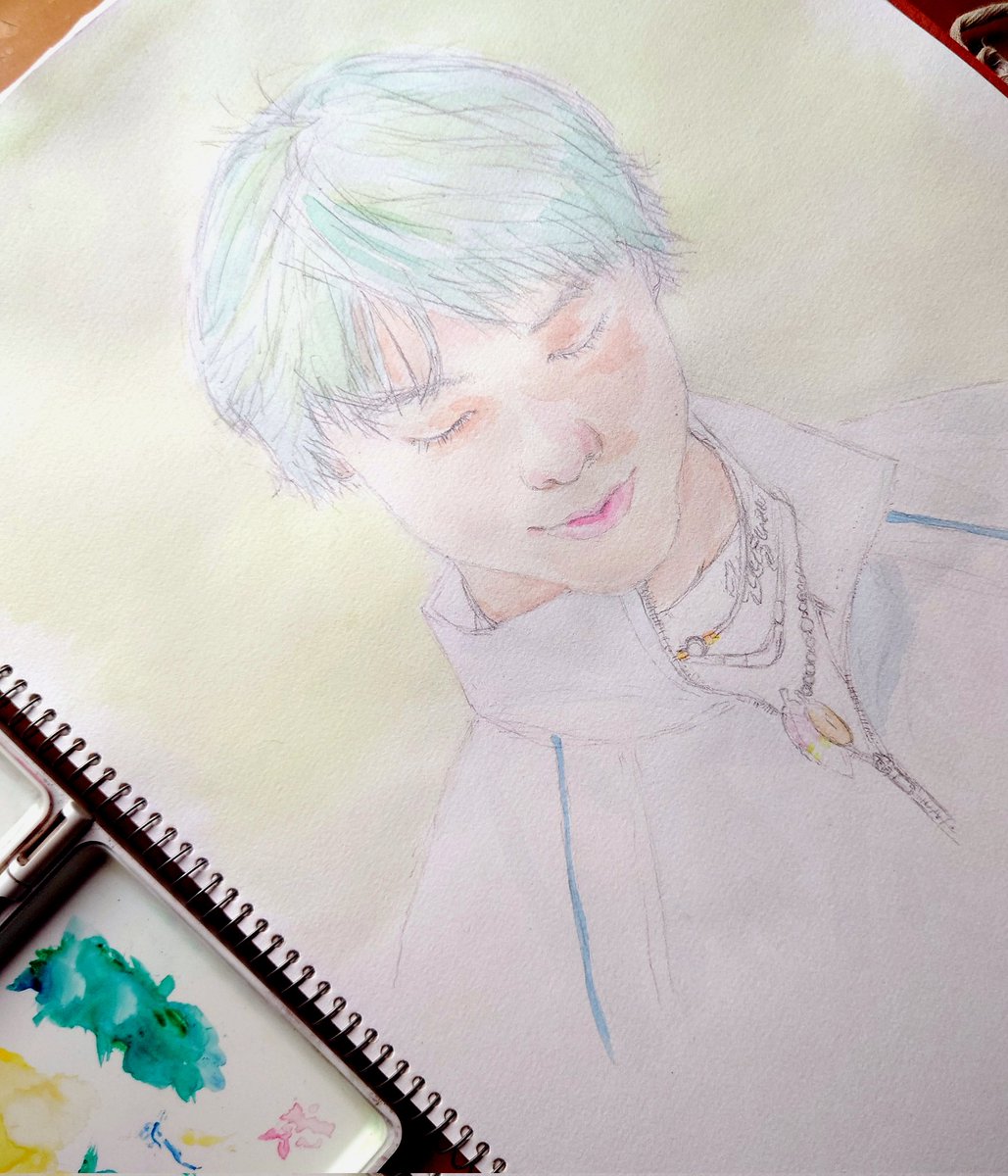 水彩、おっかなびっくりだったけど結構面白いかもしれない。 乾いてからでないと次に行けないのがもどかしいけど。 ホワラビ間に合うかな。 紙はまだうねうね😅 #羽生結弦 #羽生クラスタ絵画部 #水彩画 #YuzuruHanyu𓃵