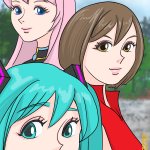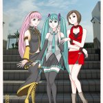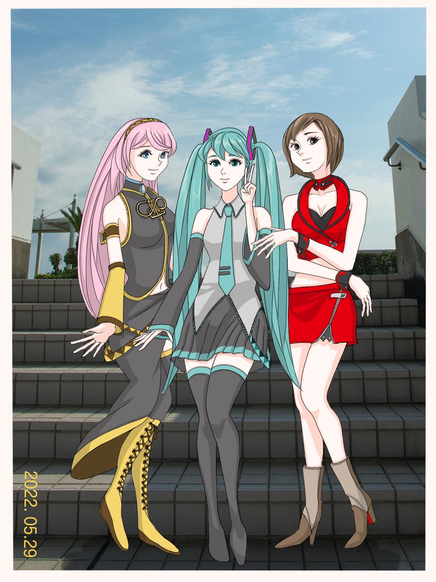 29 129 良いお天気ですね。皆様お出かけしましたか?お仕事の方はお疲れ様です。#MEIKO #巡音ルカ #初音ミク 三姉妹、お出かけ記念撮影風 #手描きイラスト 22/05/29 16:33