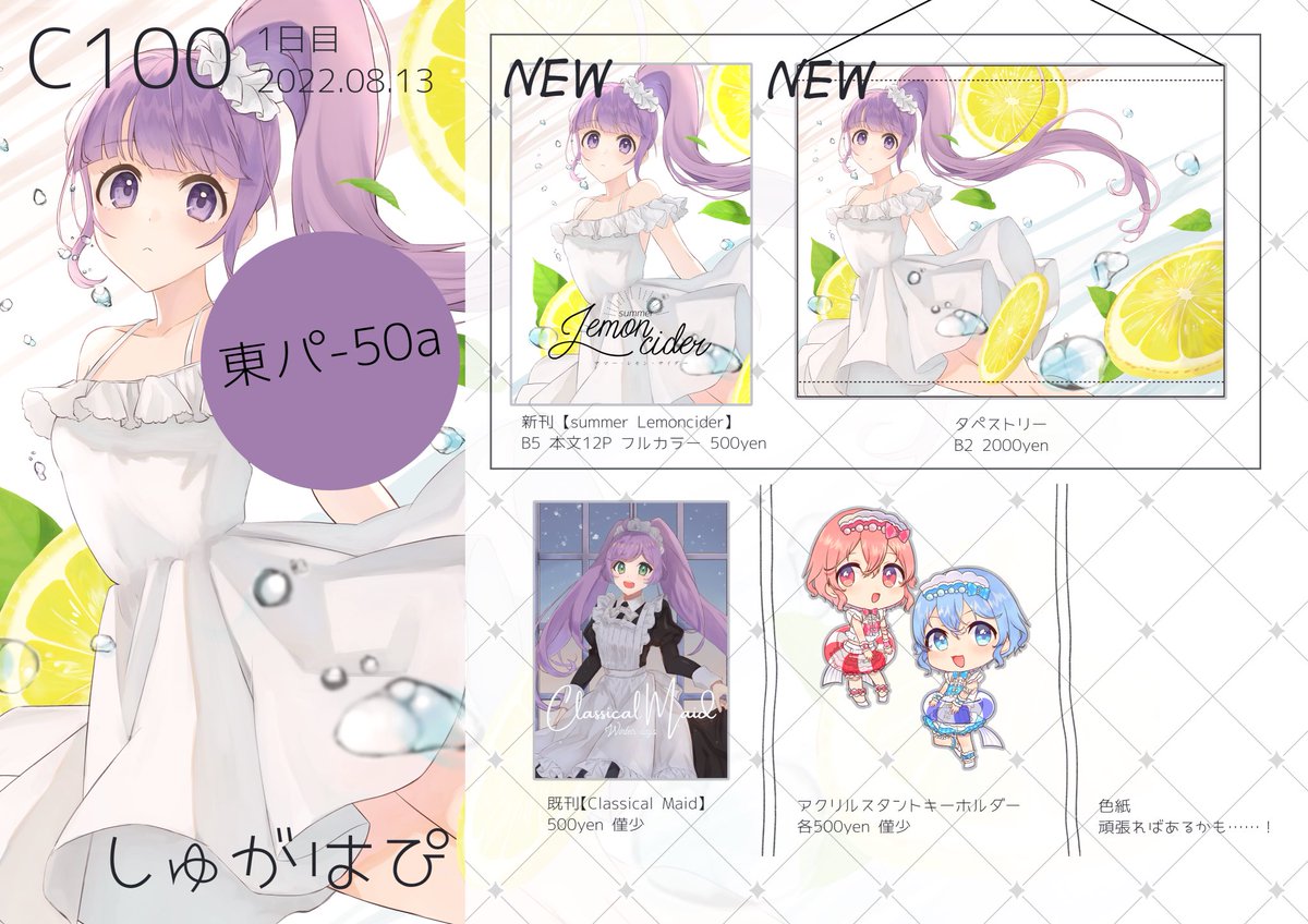 【C100 | 1日目 | 8/13(土) | 東パ-50a】 夏コミおしながきです~~~ 少しだけ既刊が出てきたので持っていきます~! 当日はよろしくお願いします!! 🍈新刊委託 melonbooks.co.jp/detail/detail.… #C100 #コミックマーケット100
