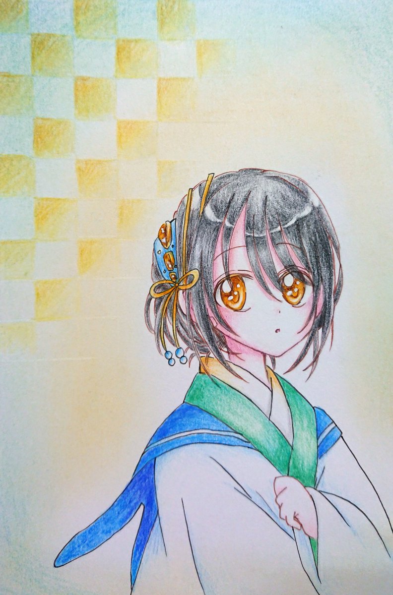 アイシャの夏祭り姿(浴衣と甚平を合わせたような感じ)完成! #グリマルファッション_和服 #色鉛筆 #グリマルシェ