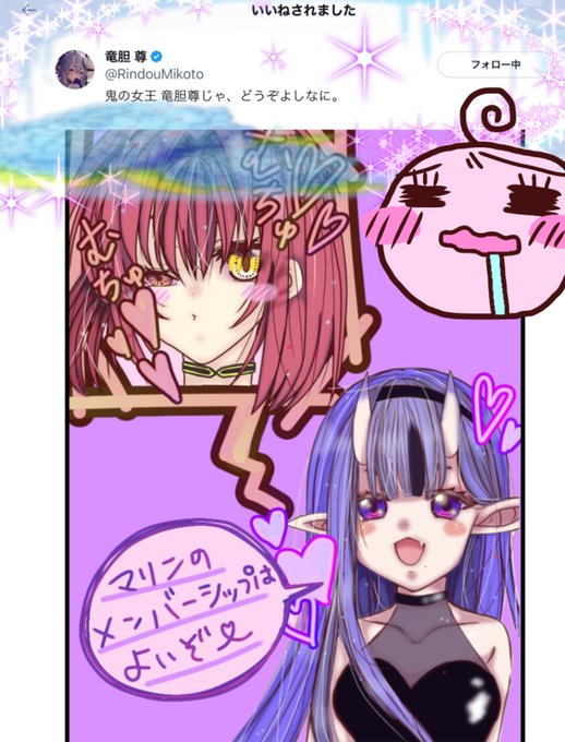 #竜胆尊 様(推し)が #宝鐘マリン 船長(推し)メンバーシップに入ってるの知って悶えた♡尊い✨️(*´ω`*) この悶えを描いてみました\(๑´ω`๑)/♡♡ #マリンのお宝 #尊絵巻