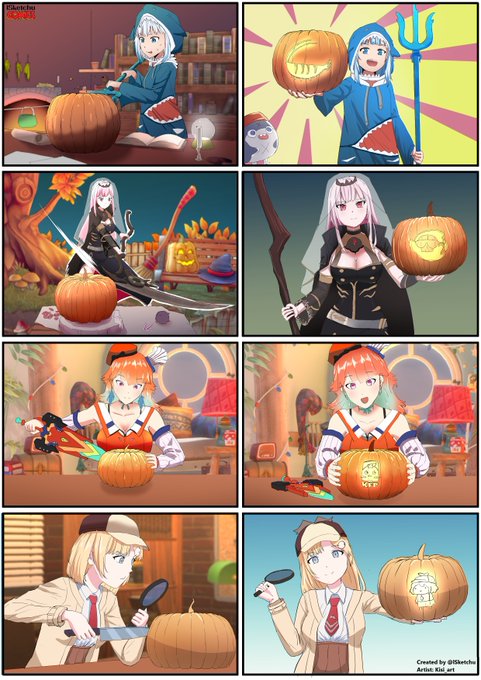 #Holoctober Comic 2: Hololive Myth Pumpkins which one is your favorite!? #gawrt #ameliaRT #callillust #artsofashes